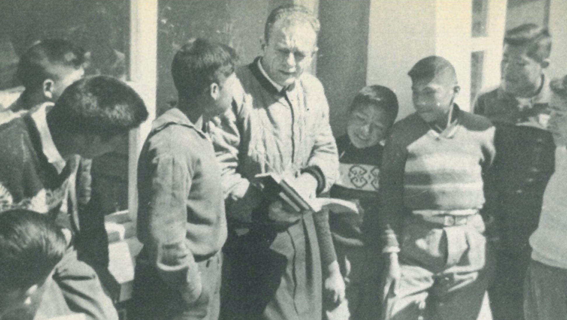 PHOTO: Brother Paul, C.F.X. at the San Jose School, Bolivia, talks to a group of students in an informal session. (Originally published in”The Xaverian,” Summer 1967).